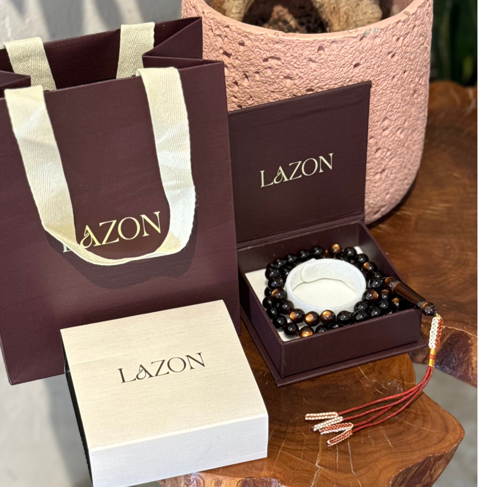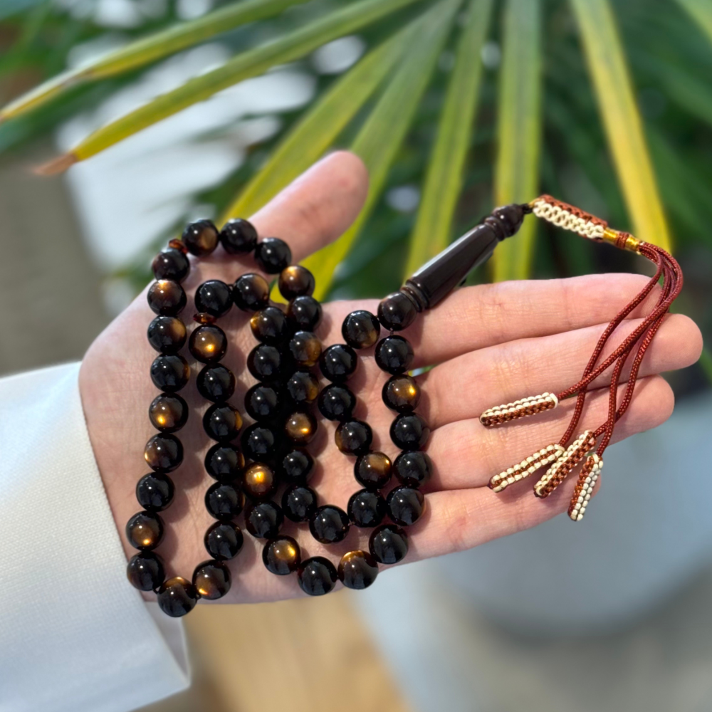 سبحة مميزة بلون أسود عميق تتخلله لمعات ذهبية براقة أشبه بعين النمر، تمنحها حضورًا قويًا ولمسة من الفخامة. خرزها المصقول يعكس الضوء بجاذبية خاصة، لتكون خيارًا مثاليًا لمن يبحث عن سبحة أنيقة تجمع بين الهيبة والذوق الرفيع.