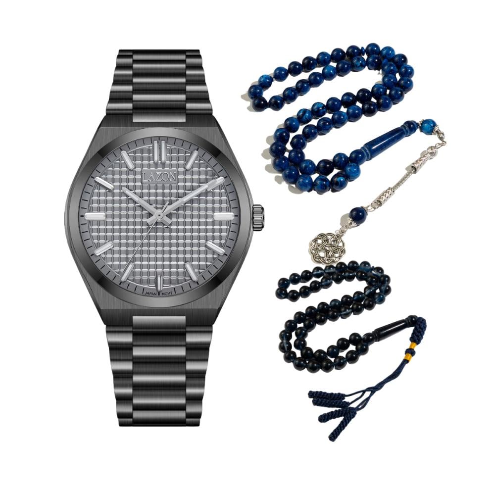 طقم مصمم بعناية ليرمز إلى الفخامة والرقي، يجمع بين ساعة لازون الراقية وسبحتين مميزتين بألوان متناغمة.
