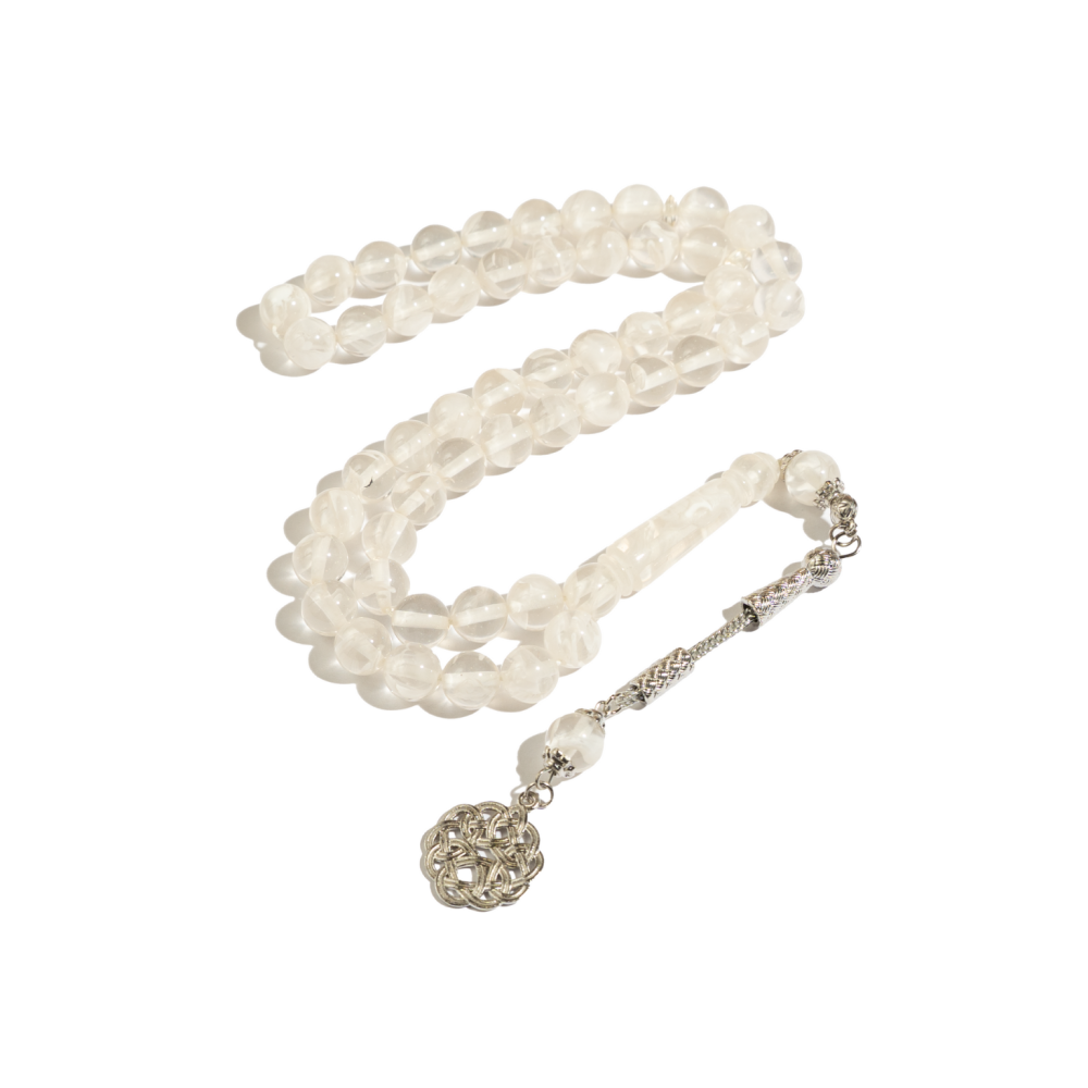 - السبحة (2) : سبحة رجالية فاخرة من حجر البكلايت أبيض شفاف بعدد 51خرزة.