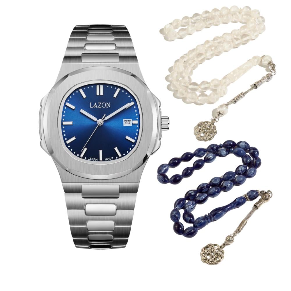 طقم مصمم بعناية ليرمز إلى الفخامة والرقي، يجمع بين ساعة لازون الراقية وسبحتين مميزتين بألوان متناغمة.