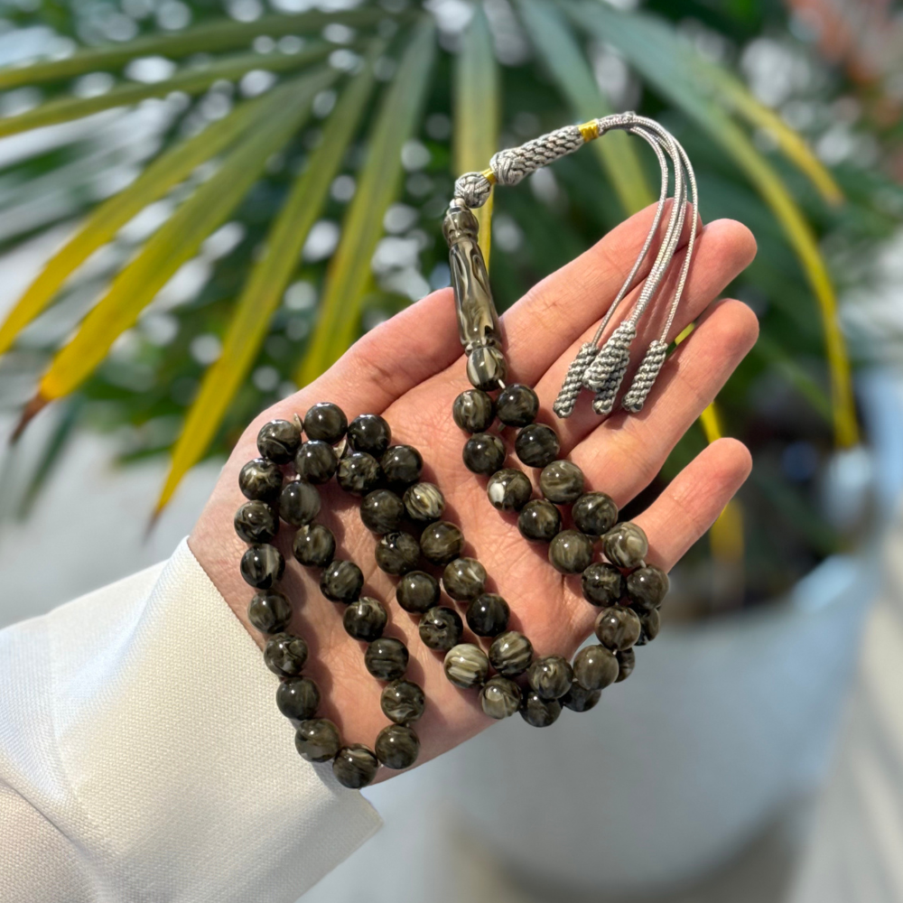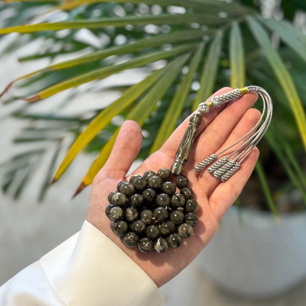 سبحة أنيقة مكونة من 51 خرزة باللون الرمادي الممزوج بخطوط رخامية ناعمة تضيف لمسة فريدة من التميز. مزودة بخيوط فضية متينة تزيدها جاذبية وأناقة، مما يجعلها مناسبة للاستخدام الشخصي أو كخيار راقٍ للهدايا.