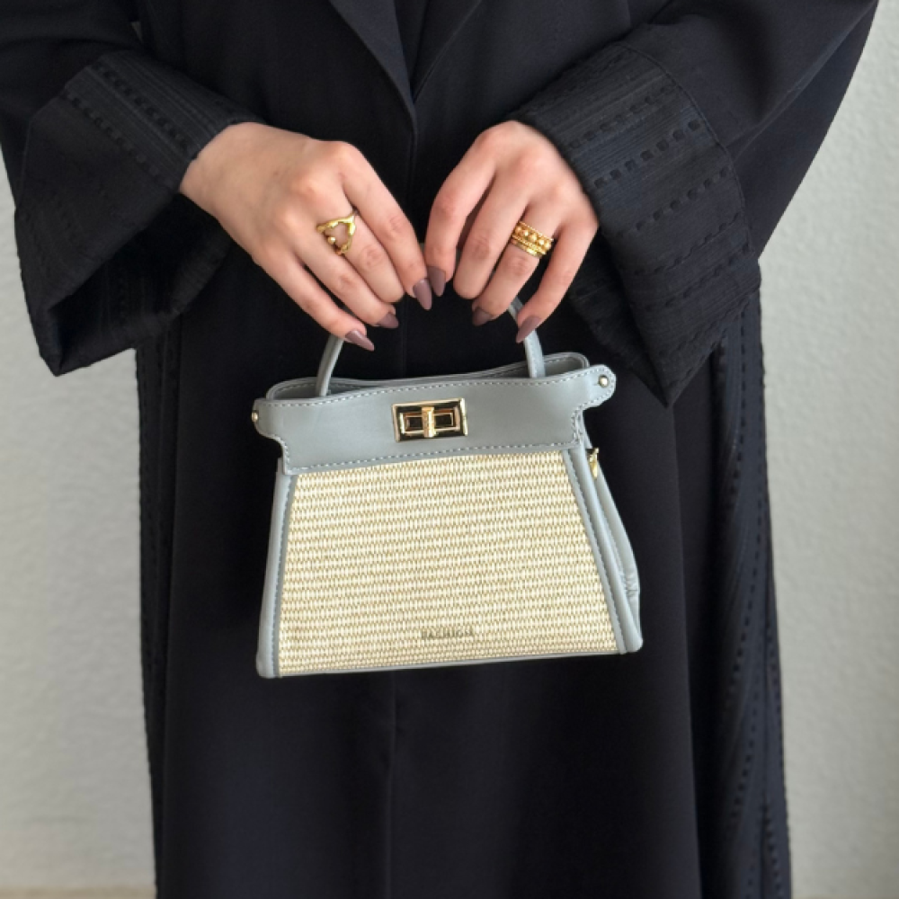 تصميم راقٍ يجمع بين برودة الرمادي العصري ودفء الخوص الطبيعي، ليمنحك إطلالة أنيقة ومتجددة في كل موسم. تفاصيلها الجلدية الناعمة باللون الرمادي وخياطتها الدقيقة تضيف لمسة فاخرة تناسب كل مناسبة من الصباح حتى المساء.