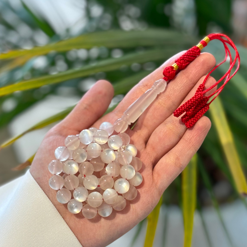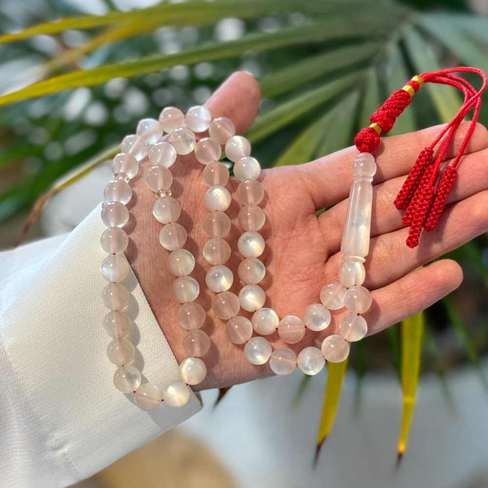 سبحة أنيقة مصنوعة من 51 خرزة بلون احمر فاتح شفاف يشعّ بلمعة هادئة تضفي لمسة من الصفاء والرقي. تتزين بخيوط حمراء متينة تضيف لمسة مبهجة وتكمل جمالها. خيار مثالي للاستخدام الشخصي أو كهدية تحمل معنى وأناقة.